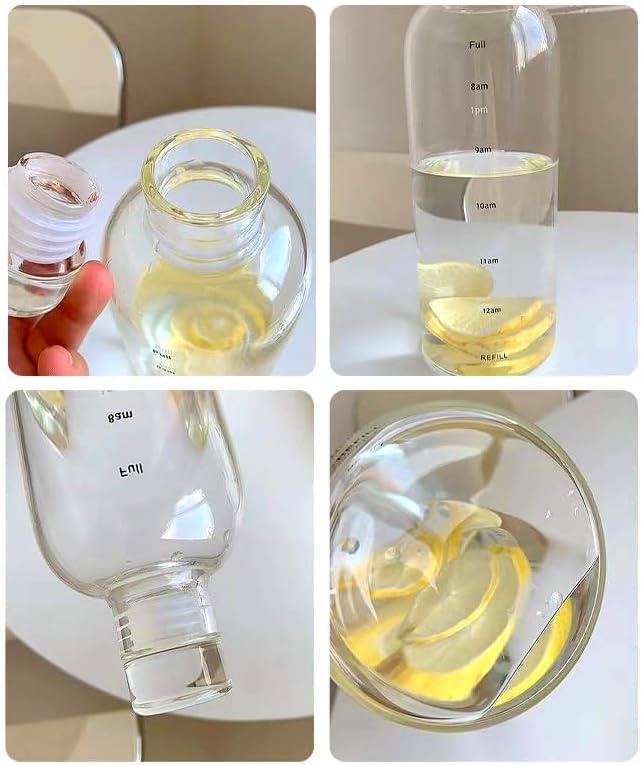 متعددة الاستخدامات: الزجاجة الشفافة مع علامات الوقت لا تعمل فقط كتذكير بشرب الماء، ولكن يمكن استخدامها كزجاجة للمشروبات اليومية/اللبن/الليمون/القهوة. تتحمل مقاومة رائعة للبرودة والحرارة، وآمنة للغسل في غسالة الأطباق والثلاجة (ملاحظة: لا تضع الغطاء مباشرة على فوهة الزجاجة بعد صب الماء المغلي في الزجاجة، لأن الحرارة ستدفع الغطاء للخارج.)