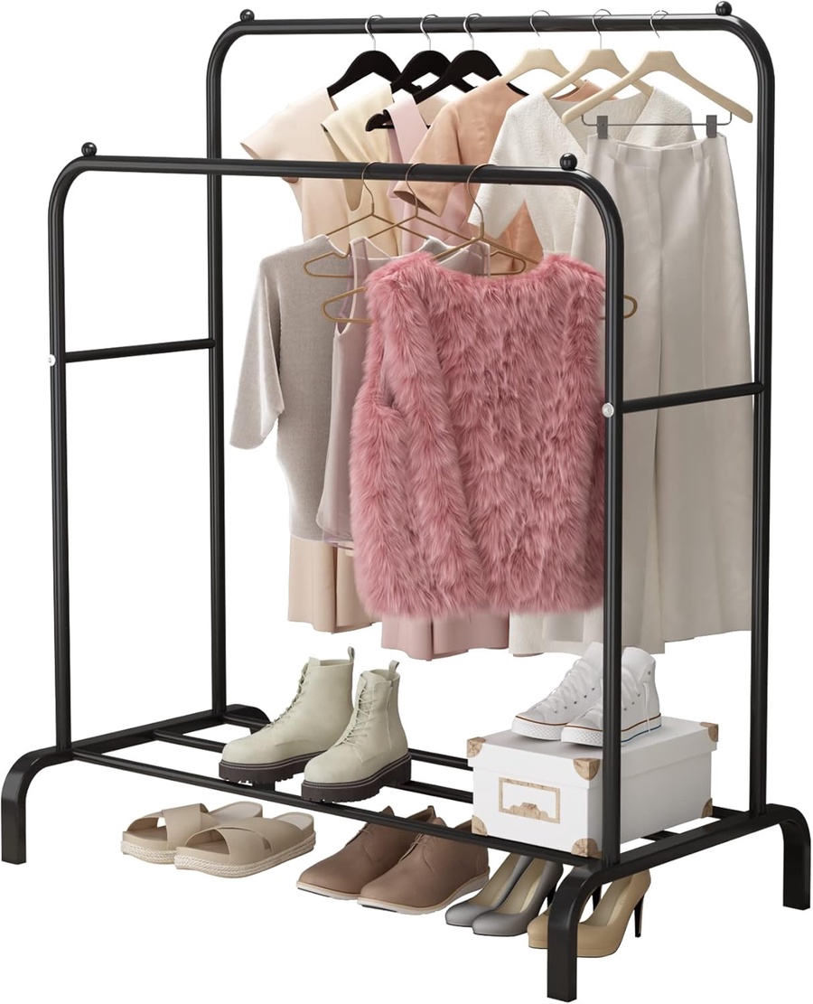 تصميم القضبان المزدوجة يمكنه استيعاب ضعف عدد الملابس لتلبية احتياجاتك الحياتية. يمكن للرف السفلي أن يستوعب أيضًا عدة أزواج من الأحذية