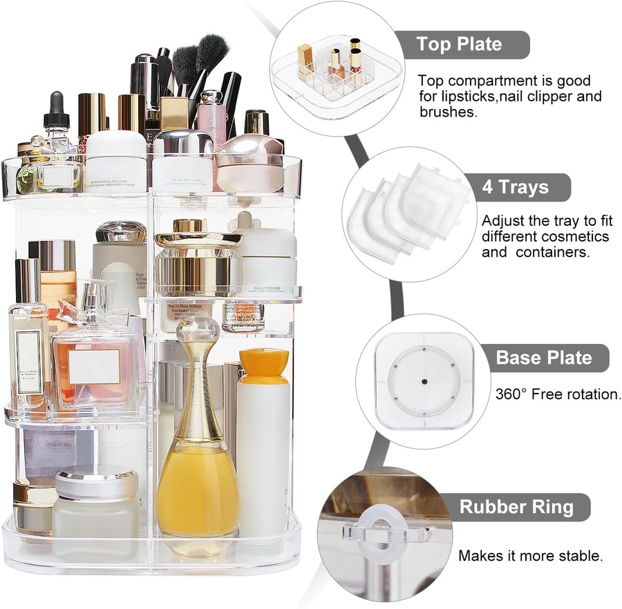 تصميم بزاوية دوارة 360 درجة يساعدكِ في العثور على مستحضرات التجميل بسهولة. يحتوي منظم المكياج على 4 صواني، ويمكن تعديل الطبقات الثمانية القابلة للتعديل لتناسب جميع مستحضرات التجميل الخاصة بكِ بأحجام وارتفاعات مختلفة