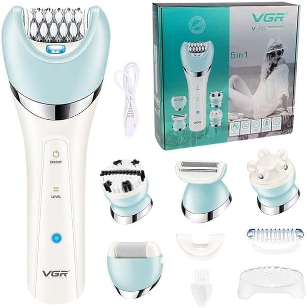 جهاز حلاقة احترافية 5 في 1 للنساء من في جي ار، للوجه والساقين وتحت الإبطين ومنطقة البيكيني وتشذيب الحواجب وتشذيب شعر الأذن والأنف، جهاز تدليك الوجه والجسم، IPX 4، قابلة للغسل بالكامل، موديل V-703
