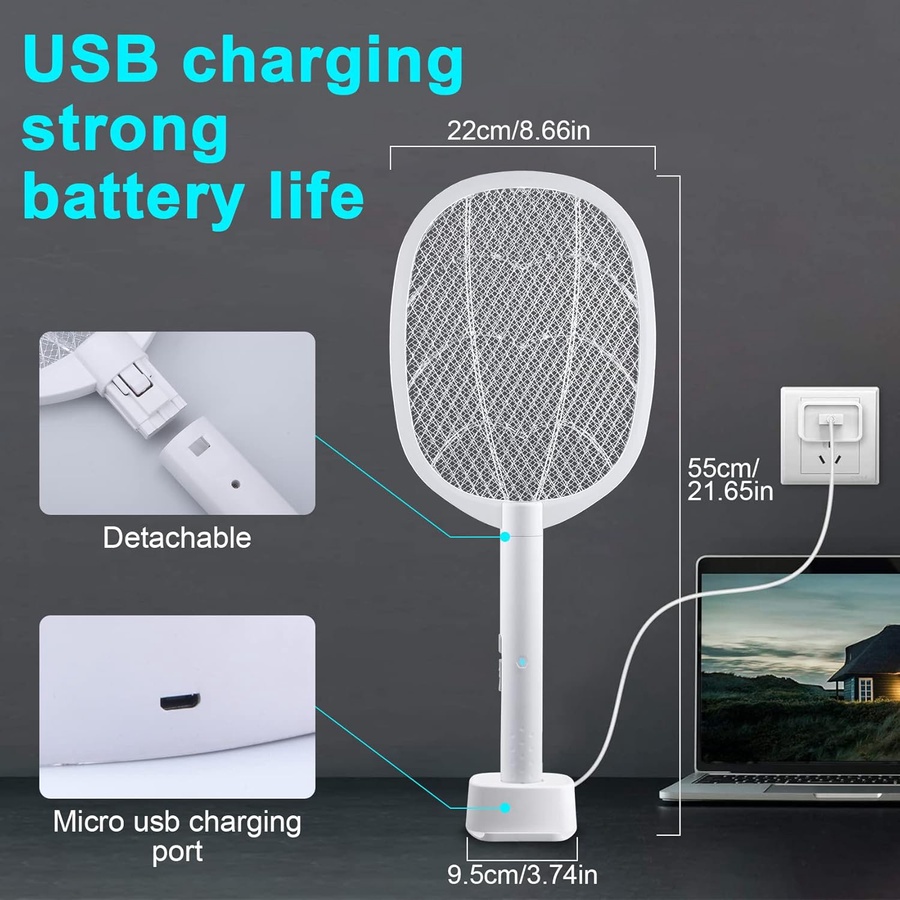 مضرب بعوض كهربائي بعجلات لقتل البعوض وذبابة الفواكه، 2 في واحد قابل لاعادة الشحن عن طريق منفذ USB للتحكم في الافات مع مصباح اضاءة ليد وشبكة امان من 3 طبقات امنة للمس